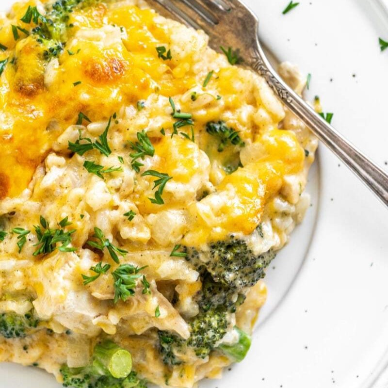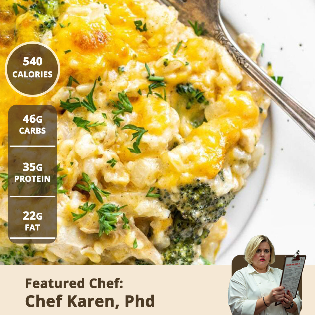 Bold, creamy, and unapologetically satisfying, this oven-baked dish layers hormone-free chicken over gut-friendly white rice, all smothered in a rich sauce made from strong bones milk, smooth Colby Jack, and a powerful boost of vegan protein and whey protein isolate. Crispy fried onions add crunch, while vitamin-rich broccoli brings freshness and balance.