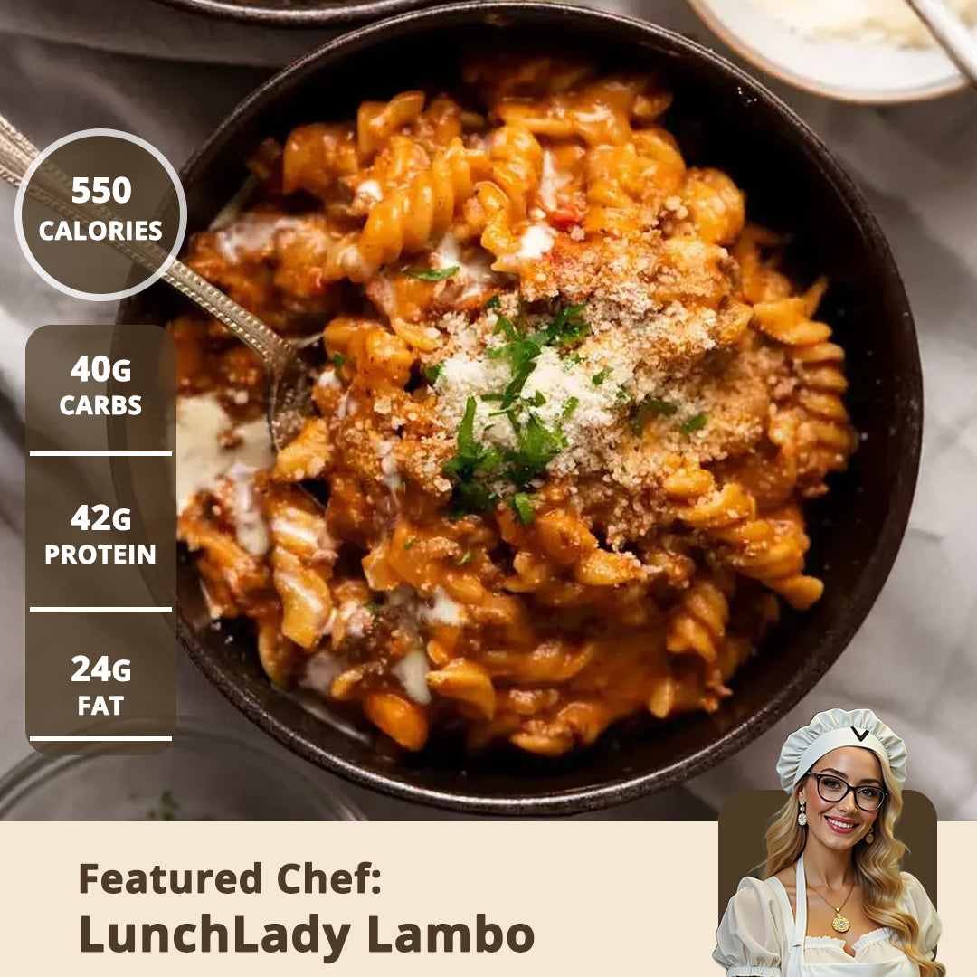 Bougie Burger Bake is your favorite cheeseburger reimagined as a gourmet pasta casserole with unapologetic flair. Elbow pasta forms the hearty base, layered with juicy ground beef and savory textured soy protein for a satisfying, protein-packed bite. A rich marinara sauce brings a tangy twist, while melted mozzarella and a golden sprinkle of parmesan create a gooey, indulgent finish. Accented with smoky paprika and fresh parsley, this elevated bake delivers all the comfort of a burger—without the bun, but with plenty of bougie charm.