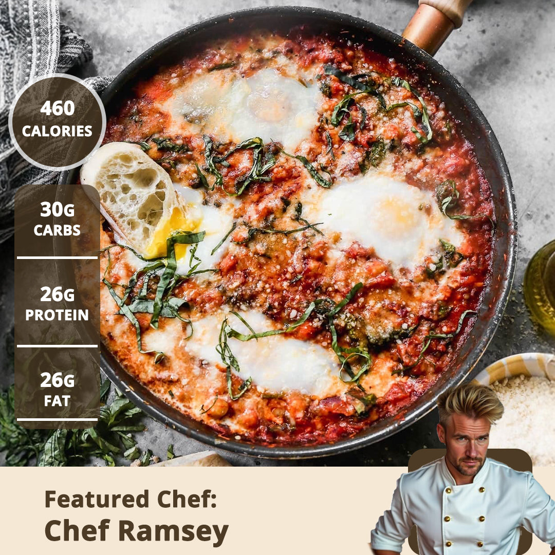 Eggstasy in Red is a bold, flavor-packed breakfast-for-dinner sensation that turns up the heat and indulgence. Fluffy whole eggs are whipped with cottage cheese, cream, and skimmed milk for a silky, protein-rich base, then layered with smoky bacon, savory beef, and spiced fajita veggies. Golden rosemary potatoes add a rustic crunch, while melted cheddar blankets the dish in creamy decadence. A vibrant marinara swirl brings a tangy red twist, perfectly balanced by garlic, onion, and pepper. With textured soy protein and whey isolate for extra fuel, this dish is a sizzling celebration of comfort, color, and culinary ecstasy.